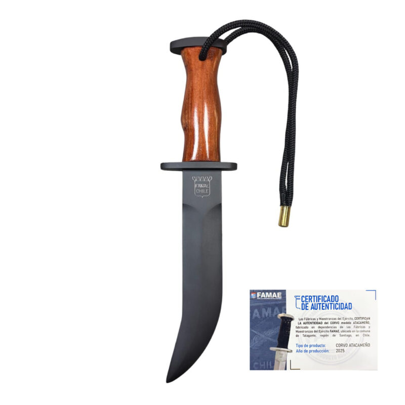 El Corvo Atacameño FAMAE con empuñadura de madera es una pieza emblemática que combina tradición militar chilena, artesanía y un diseño inconfundible. Inspirado en el histórico corvo utilizado por el Ejército de Chile, este modelo destaca por su característica hoja curva de aproximadamente 45°, conocida como estilo Atacameño, que le otorga una estética única y una fuerte identidad histórica.