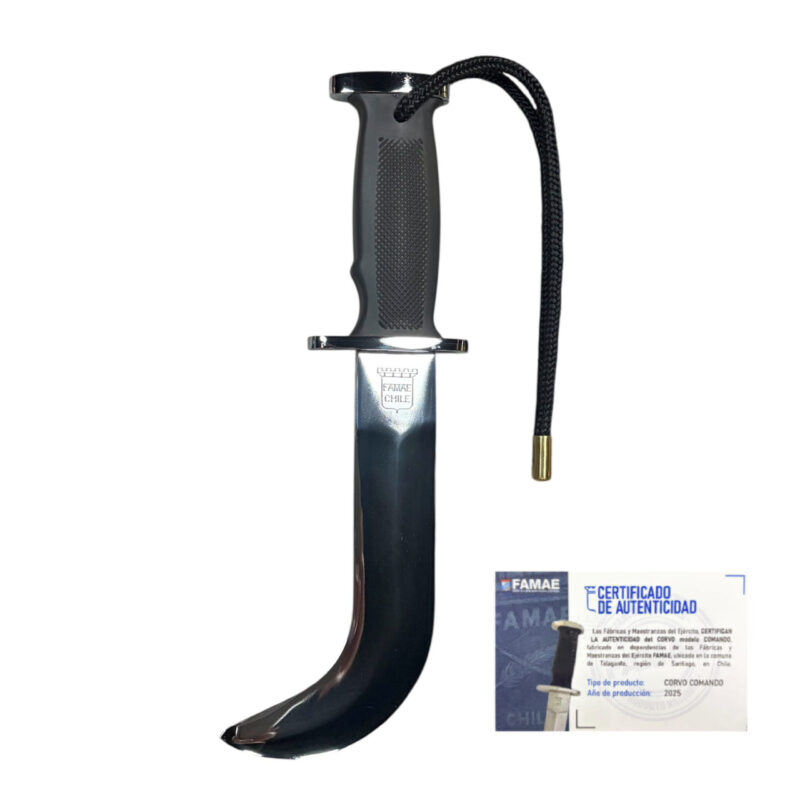 El Corvo FAMAE comando cromado con mango de goma negro es una pieza que combina tradición militar chilena con materiales modernos y funcionales. Su hoja curva, fabricada en acero de alta resistencia con acabado cromado, ofrece una estética elegante y una gran durabilidad, resaltando cada detalle del icónico diseño del corvo.