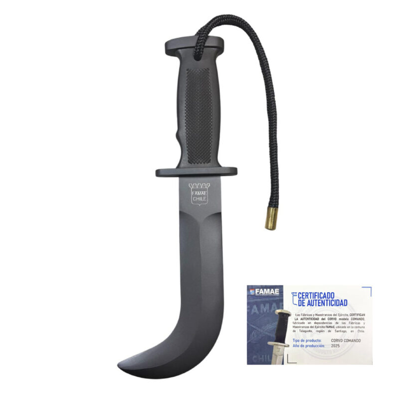 El acabado negro de alta resistencia no solo aporta una estética táctica sobria y elegante, sino que también ayuda a proteger la hoja frente al desgaste. Cada corvo es elaborado siguiendo los estándares de la industria de defensa chilena y se entrega con certificado de autenticidad, garantizando su origen y fabricación oficial.